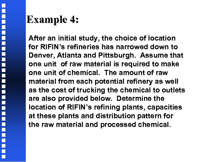 Example 4: After an initial study, the choice of location for RIFIN’s refineries has narrowed down to Denver, Atlanta and Pittsburgh. Assume that one unit of raw material is required to make one unit of chemical. The amount of raw material from each potential refinery as well as the cost of trucking the chemical to outlets are also provided below. Determine the location of RIFIN’s refining plants, capacities at these plants and distribution pattern for the raw material and processed chemical.