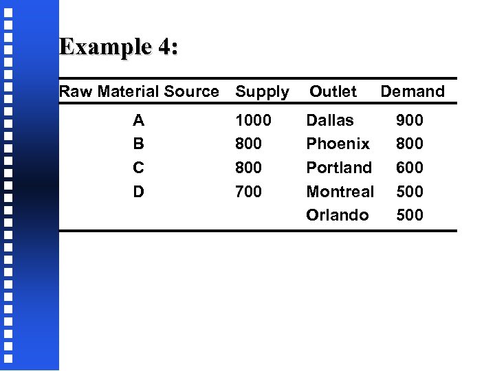 Example 4: Raw Material Source Supply A B C D 1000 800 700 Outlet Dallas Phoenix Portland Montreal Orlando Demand 900 800 600 500