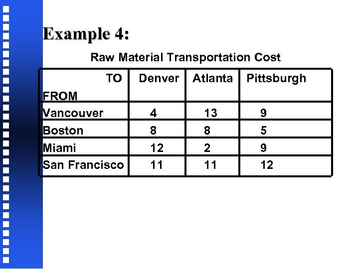 Example 4: Raw Material Transportation Cost TO FROM Vancouver Boston Miami San Francisco Denver Atlanta 4 8 12 11 13 8 2 11 Pittsburgh 9 5 9 12