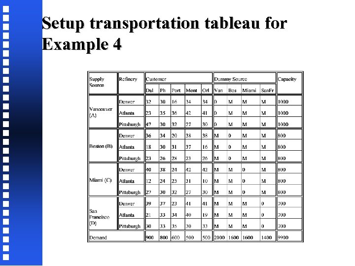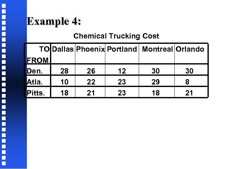 Example 4: Chemical Trucking Cost TO Dallas Phoenix Portland Montreal Orlando FROM Den. 28 26 12 30 30 Atla. 10 22 23 29 8 Pitts. 18 21 23 18 21