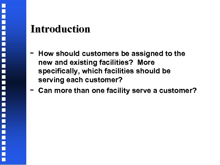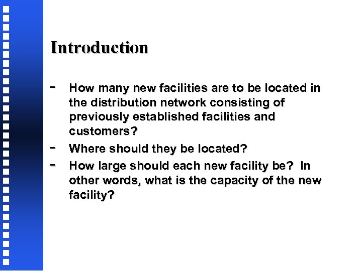 Introduction - How many new facilities are to be located in the distribution network consisting of previously established facilities and customers? Where should they be located? How large should each new facility be? In other words, what is the capacity of the new facility?