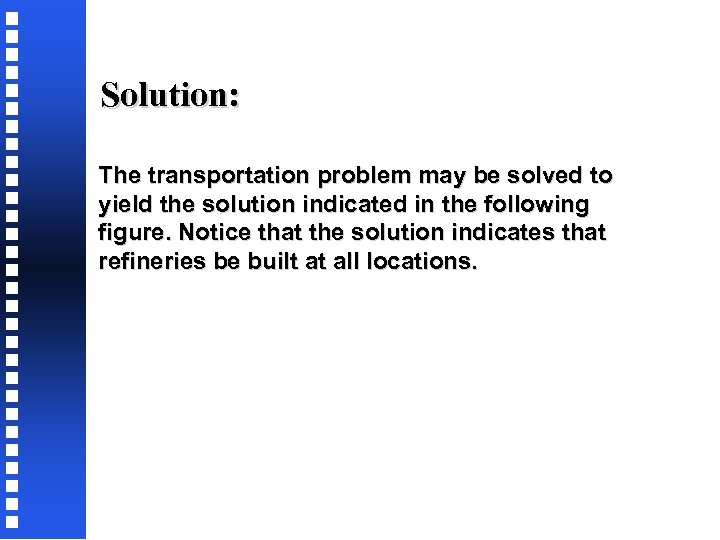 Solution: The transportation problem may be solved to yield the solution indicated in the following figure. Notice that the solution indicates that refineries be built at all locations.
