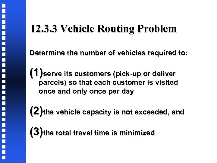 12. 3. 3 Vehicle Routing Problem Determine the number of vehicles required to: (1)serve its customers (pick-up or deliver parcels) so that each customer is visited once and only once per day (2)the vehicle capacity is not exceeded, and (3)the total travel time is minimized