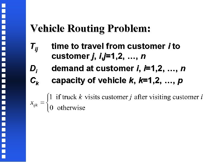 Vehicle Routing Problem: Tij Di Ck time to travel from customer i to customer j, i, j=1, 2, …, n demand at customer i, i=1, 2, …, n capacity of vehicle k, k=1, 2, …, p