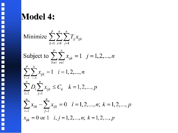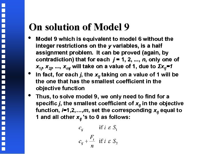 On solution of Model 9 • • • Model 9 which is equivalent to model 6 without the integer restrictions on the y variables, is a half assignment problem. It can be proved (again, by contradiction) that for each j = 1, 2, . . . , n, only one of x 1 j, x 2 j, . . . , xmj will take on a value of 1, due to Σxij=1 In fact, for each j, the xij taking on a value of 1 will be the one that has the smallest coefficient in the objective function Thus, to solve model 9, we only need to find for a specific j, the smallest coefficient of xij in the objective function, i=1, 2, …, m, set the corresponding xij equal to 1 and all other xij 's to 0 as follows:
