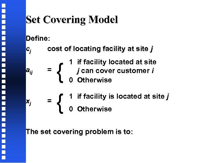 Set Covering Model Define: cj cost of locating facility at site j aij xj = = { { 1 if facility located at site j can cover customer i 0 Otherwise 1 if facility is located at site j 0 Otherwise The set covering problem is to: