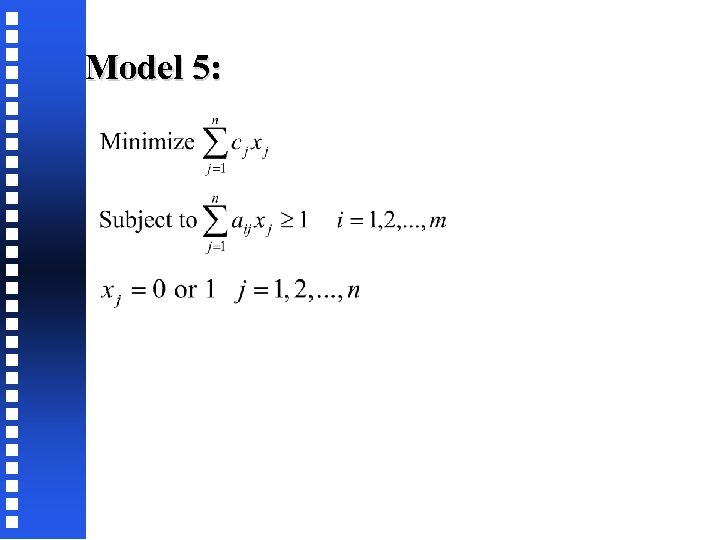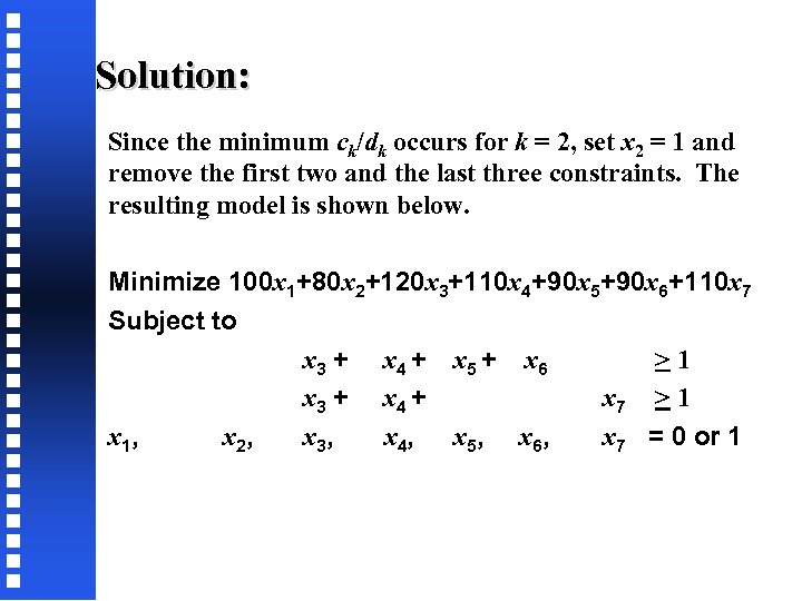 Solution: Since the minimum ck/dk occurs for k = 2, set x 2 = 1 and remove the first two and the last three constraints. The resulting model is shown below. Minimize 100 x 1+80 x 2+120 x 3+110 x 4+90 x 5+90 x 6+110 x 7 Subject to x 3 + x 4 + x 5 + x 6 >1 x 3 + x 4 + x 7 > 1 x 1, x 2, x 3, x 4, x 5, x 6, x 7 = 0 or 1