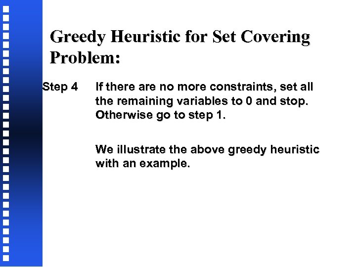 Greedy Heuristic for Set Covering Problem: Step 4 If there are no more constraints, set all the remaining variables to 0 and stop. Otherwise go to step 1. We illustrate the above greedy heuristic with an example.