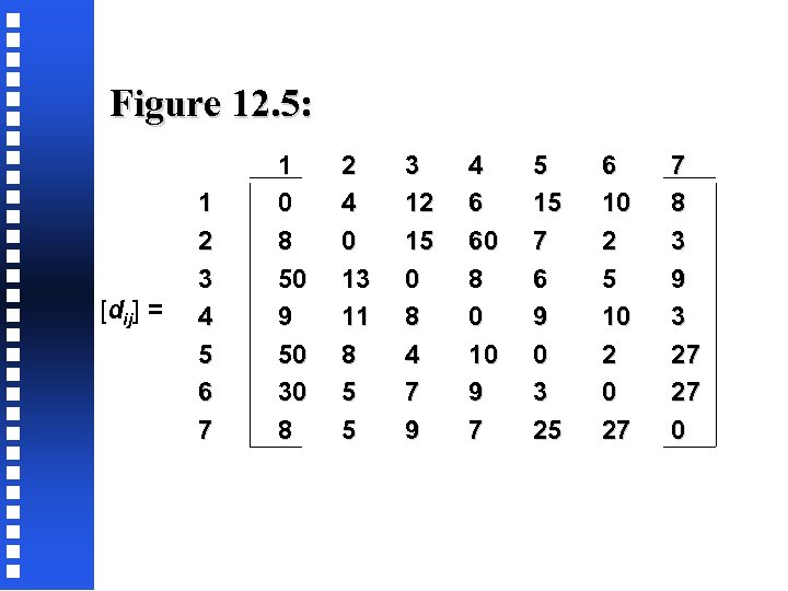 Figure 12. 5: [dij] = 1 2 3 4 5 6 7 1 0 8 50 9 50 30 8 2 4 0 13 11 8 5 5 3 12 15 0 8 4 7 9 4 6 60 8 0 10 9 7 5 15 7 6 9 0 3 25 6 10 2 5 10 2 0 27 7 8 3 9 3 27 27 0
