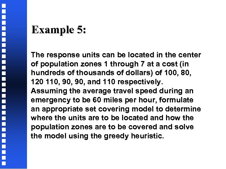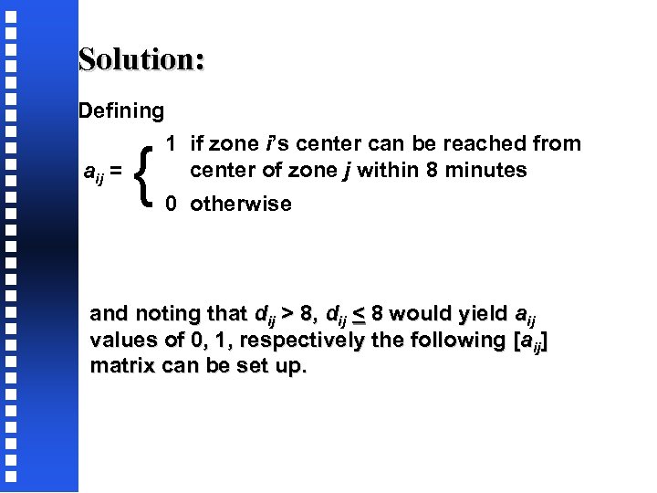 Solution: Defining aij = { 1 if zone i’s center can be reached from center of zone j within 8 minutes 0 otherwise and noting that dij > 8, dij < 8 would yield aij values of 0, 1, respectively the following [aij] matrix can be set up.