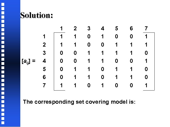 Solution: [aij] = 1 2 3 4 5 6 7 1 1 1 0 0 1 2 1 1 0 0 1 1 1 3 0 0 1 1 0 4 1 0 1 1 0 0 1 5 0 1 1 0 6 0 1 1 0 The corresponding set covering model is: 7 1 1 0 0 1
