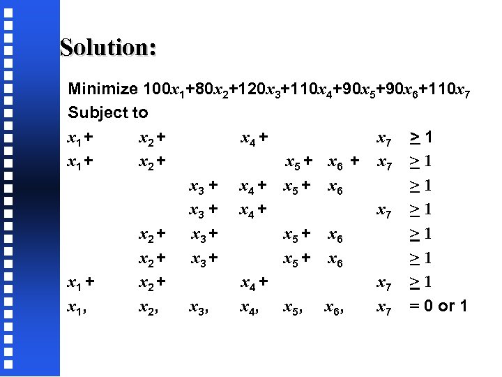 Solution: Minimize 100 x 1+80 x 2+120 x 3+110 x 4+90 x 5+90 x 6+110 x 7 Subject to x 1 + x 2 + x 4 + x 7 > 1 x 1 + x 2 + x 5 + x 6 + x 7 > 1 x 3 + x 4 + x 5 + x 6 >1 x 3 + x 4 + x 7 > 1 x 2 + x 3 + x 5 + x 6 >1 x 1 + x 2 + x 4 + x 7 > 1 x 1, x 2, x 3, x 4, x 5, x 6, x 7 = 0 or 1