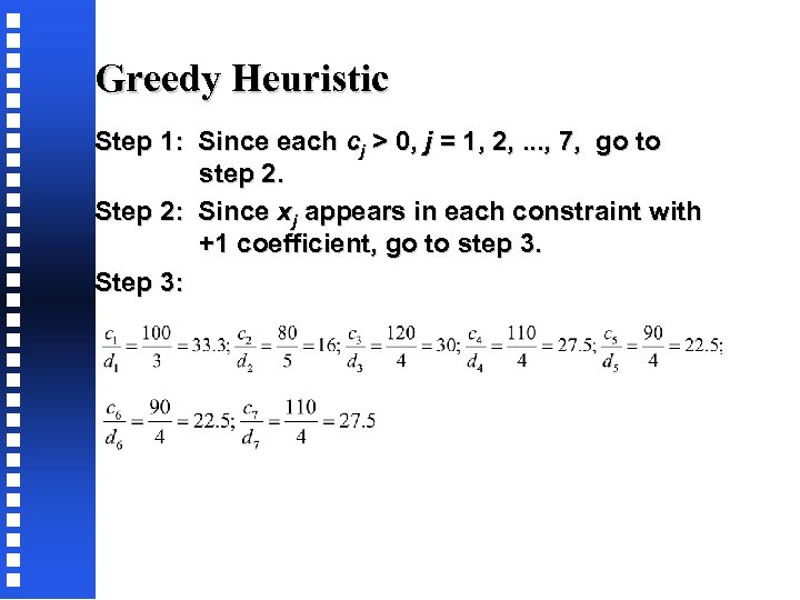 Greedy Heuristic Step 1: Since each cj > 0, j = 1, 2, . . . , 7, go to step 2. Step 2: Since xj appears in each constraint with +1 coefficient, go to step 3. Step 3: