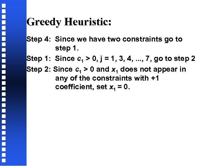 Greedy Heuristic: Step 4: Since we have two constraints go to step 1. Step 1: Since c 1 > 0, j = 1, 3, 4, . . . , 7, go to step 2 Step 2: Since c 1 > 0 and x 1 does not appear in any of the constraints with +1 coefficient, set x 1 = 0.