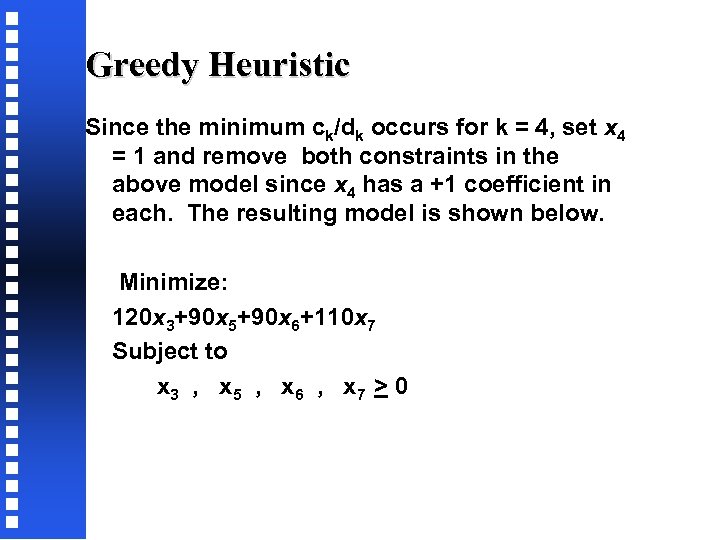 Greedy Heuristic Since the minimum ck/dk occurs for k = 4, set x 4 = 1 and remove both constraints in the above model since x 4 has a +1 coefficient in each. The resulting model is shown below. Minimize: 120 x 3+90 x 5+90 x 6+110 x 7 Subject to x 3 , x 5 , x 6 , x 7 > 0