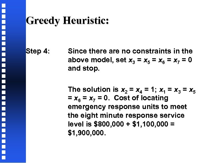 Greedy Heuristic: Step 4: Since there are no constraints in the above model, set x 3 = x 5 = x 6 = x 7 = 0 and stop. The solution is x 2 = x 4 = 1; x 1 = x 3 = x 5 = x 6 = x 7 = 0. Cost of locating emergency response units to meet the eight minute response service level is $800, 000 + $1, 100, 000 = $1, 900, 000.