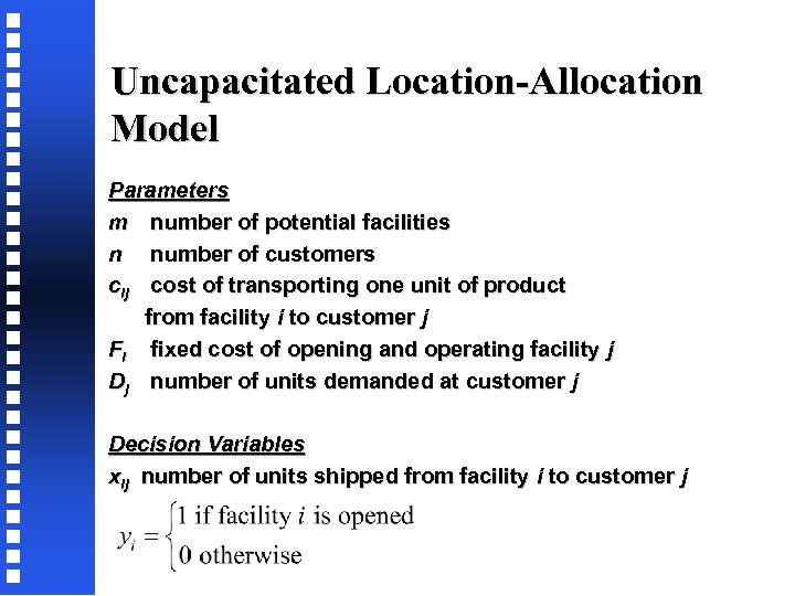 Uncapacitated Location-Allocation Model Parameters m number of potential facilities n number of customers cij cost of transporting one unit of product from facility i to customer j Fi fixed cost of opening and operating facility j Dj number of units demanded at customer j Decision Variables xij number of units shipped from facility i to customer j