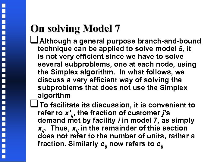 On solving Model 7 q. Although a general purpose branch-and-bound technique can be applied to solve model 5, it is not very efficient since we have to solve several subproblems, one at each node, using the Simplex algorithm. In what follows, we discuss a very efficient way of solving the subproblems that does not use the Simplex algorithm q. To facilitate its discussion, it is convenient to refer to x’ij, the fraction of customer j’s demand met by facility i in model 7, as simply xij. Thus, xij in the remainder of this section does not refer to the number of units, rather a fraction. Similarly cij now refers to cij