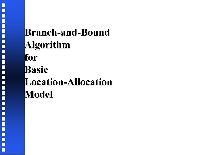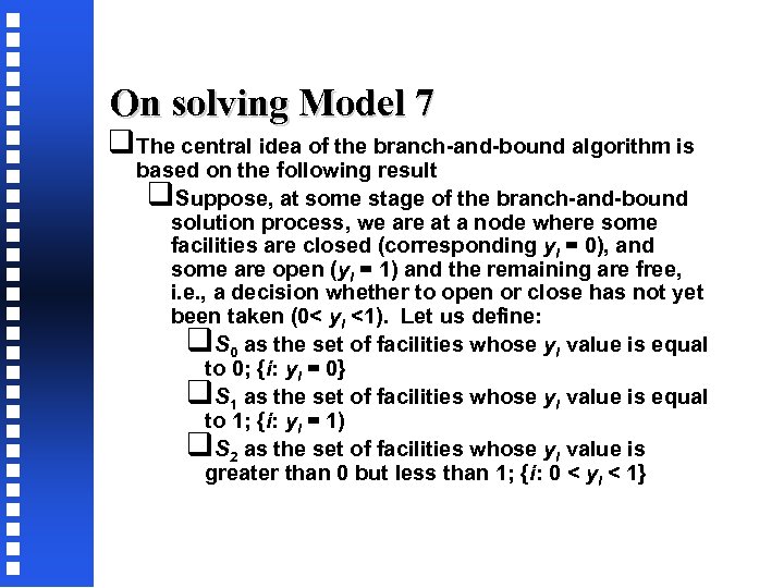 On solving Model 7 q. The central idea of the branch-and-bound algorithm is based on the following result q. Suppose, at some stage of the branch-and-bound solution process, we are at a node where some facilities are closed (corresponding yi = 0), and some are open (yi = 1) and the remaining are free, i. e. , a decision whether to open or close has not yet been taken (0< yi <1). Let us define: q. S 0 as the set of facilities whose yi value is equal to 0; {i: yi = 0} q. S 1 as the set of facilities whose yi value is equal to 1; {i: yi = 1) q. S 2 as the set of facilities whose yi value is greater than 0 but less than 1; {i: 0 < yi < 1}