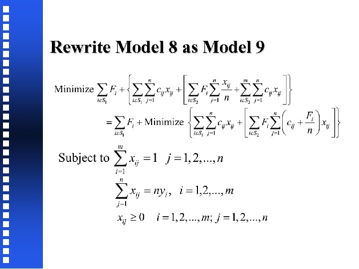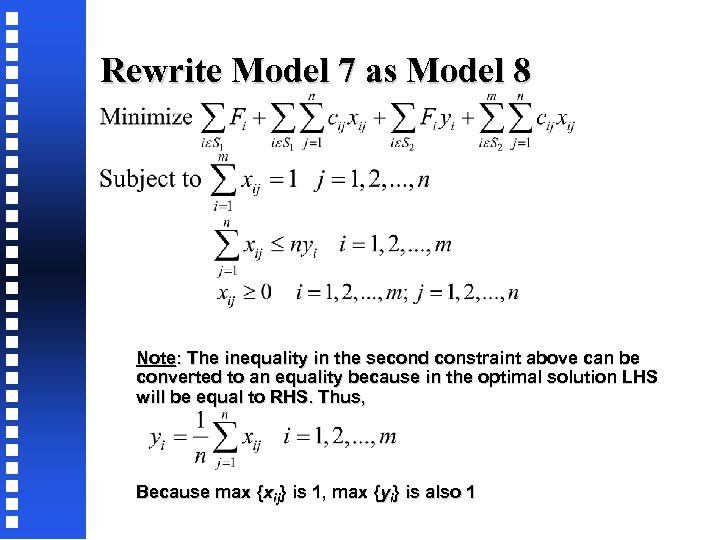 Rewrite Model 7 as Model 8 Note: The inequality in the second constraint above can be converted to an equality because in the optimal solution LHS will be equal to RHS. Thus, Because max {xij} is 1, max {yi} is also 1