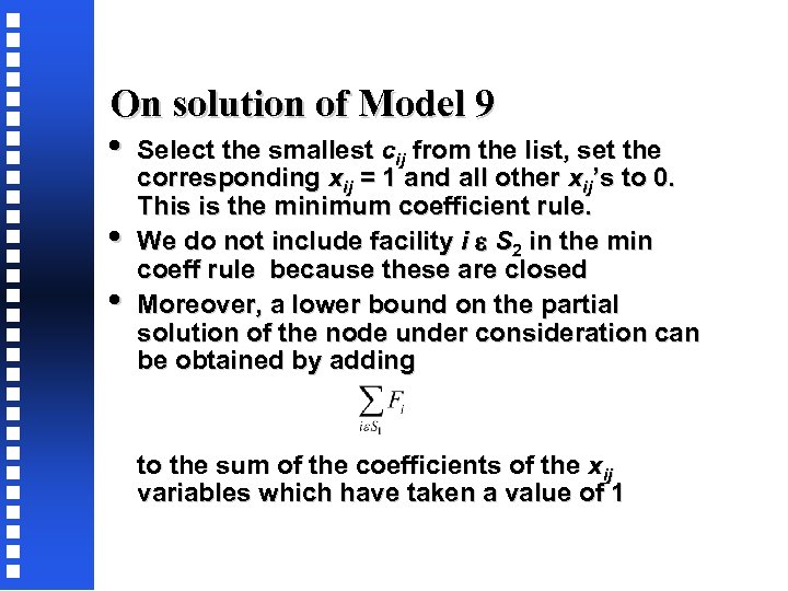 On solution of Model 9 • Select the smallest cij from the list, set the • • corresponding xij = 1 and all other xij’s to 0. This is the minimum coefficient rule. We do not include facility i S 2 in the min coeff rule because these are closed Moreover, a lower bound on the partial solution of the node under consideration can be obtained by adding to the sum of the coefficients of the xij variables which have taken a value of 1