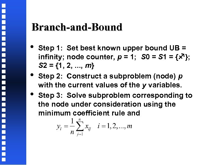 Branch-and-Bound • • • Step 1: Set best known upper bound UB = infinity; node counter, p = 1; S 0 = S 1 = { }; S 2 = {1, 2, . . . , m} Step 2: Construct a subproblem (node) p with the current values of the y variables. Step 3: Solve subproblem corresponding to the node under consideration using the minimum coefficient rule and
