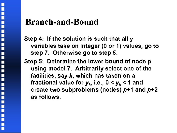 Branch-and-Bound Step 4: If the solution is such that all y variables take on integer (0 or 1) values, go to step 7. Otherwise go to step 5. Step 5: Determine the lower bound of node p using model 7. Arbitrarily select one of the facilities, say k, which has taken on a fractional value for yk, i. e. , 0 < yk < 1 and create two subproblems (nodes) p+1 and p+2 as follows.