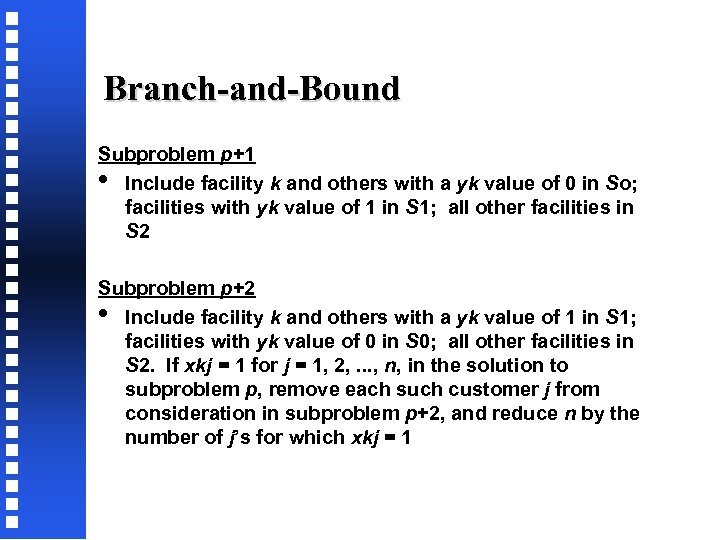 Branch-and-Bound Subproblem p+1 • Include facility k and others with a yk value of 0 in So; facilities with yk value of 1 in S 1; all other facilities in S 2 Subproblem p+2 • Include facility k and others with a yk value of 1 in S 1; facilities with yk value of 0 in S 0; all other facilities in S 2. If xkj = 1 for j = 1, 2, . . . , n, in the solution to subproblem p, remove each such customer j from consideration in subproblem p+2, and reduce n by the number of j’s for which xkj = 1