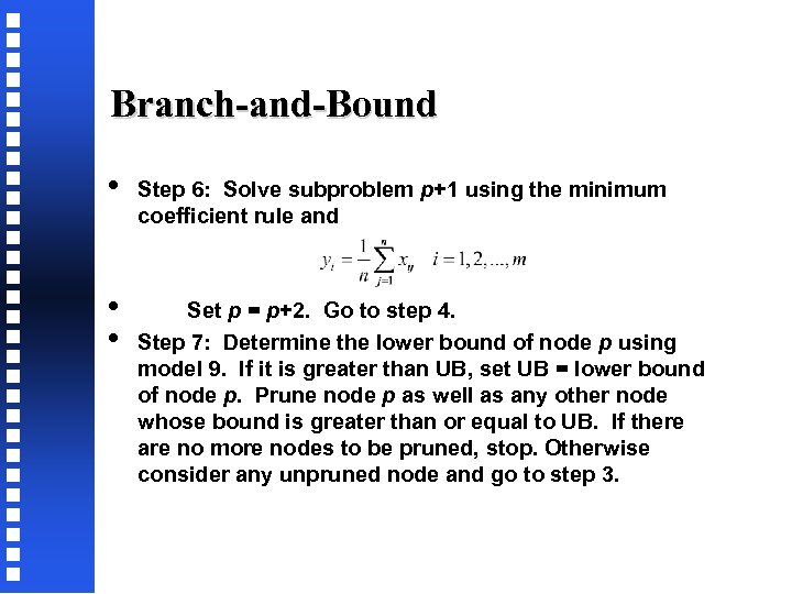 Branch-and-Bound • Step 6: Solve subproblem p+1 using the minimum coefficient rule and • • Set p = p+2. Go to step 4. Step 7: Determine the lower bound of node p using model 9. If it is greater than UB, set UB = lower bound of node p. Prune node p as well as any other node whose bound is greater than or equal to UB. If there are no more nodes to be pruned, stop. Otherwise consider any unpruned node and go to step 3.