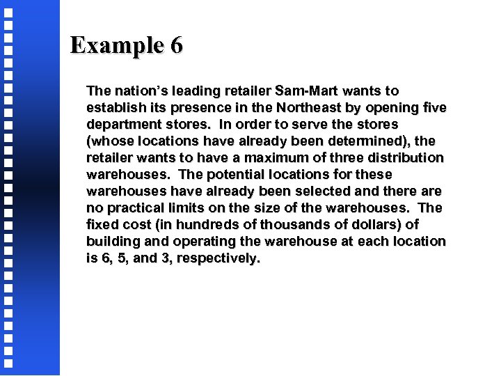 Example 6 The nation’s leading retailer Sam-Mart wants to establish its presence in the Northeast by opening five department stores. In order to serve the stores (whose locations have already been determined), the retailer wants to have a maximum of three distribution warehouses. The potential locations for these warehouses have already been selected and there are no practical limits on the size of the warehouses. The fixed cost (in hundreds of thousands of dollars) of building and operating the warehouse at each location is 6, 5, and 3, respectively.