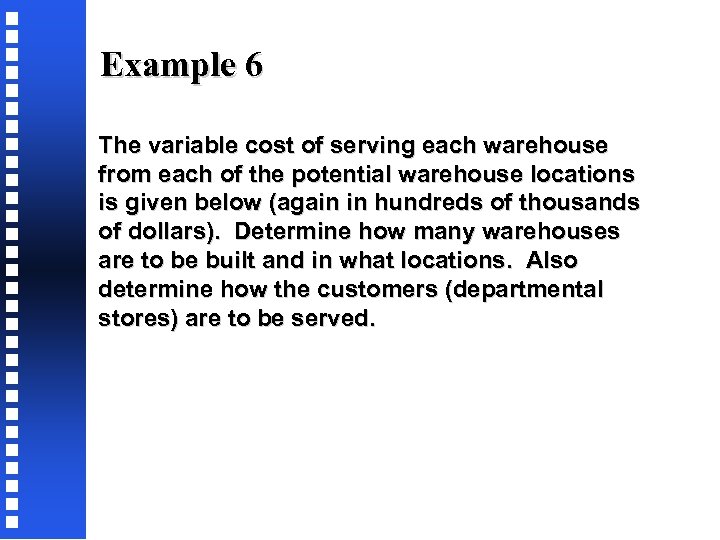 Example 6 The variable cost of serving each warehouse from each of the potential warehouse locations is given below (again in hundreds of thousands of dollars). Determine how many warehouses are to be built and in what locations. Also determine how the customers (departmental stores) are to be served.