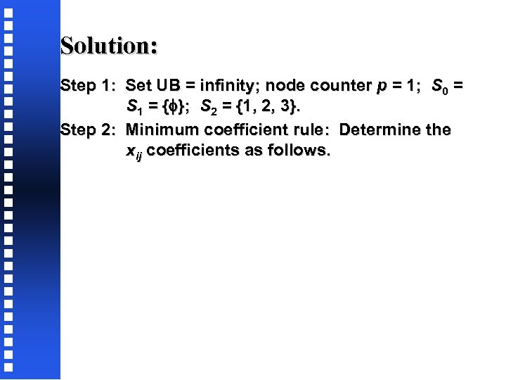 Solution: Step 1: Set UB = infinity; node counter p = 1; S 0 = S 1 = { }; S 2 = {1, 2, 3}. Step 2: Minimum coefficient rule: Determine the xij coefficients as follows.