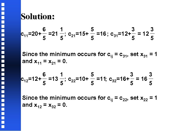 Solution: 5 1 3 3 c 11=20; c 21 =15+ =16 ; c 31=12+ =12 4 4 Since the minimum occurs for cij = c 31, set x 31 = 1 and x 11 = x 21 = 0. 5 1 3 3 c 12=12; c 22 =10+ =11 ; c 32=16+ =16 4 4 Since the minimum occurs for cij = c 22, set x 22 = 1 and x 12 = x 32 = 0.