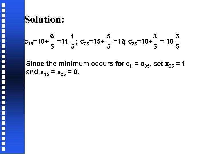 Solution: 6 1 5 3 3 c 15=10+ =11 ; c 25=15+ =16; c 35=10+ = 10 5 5 5 Since the minimum occurs for cij = c 35, set x 35 = 1 and x 15 = x 25 = 0.