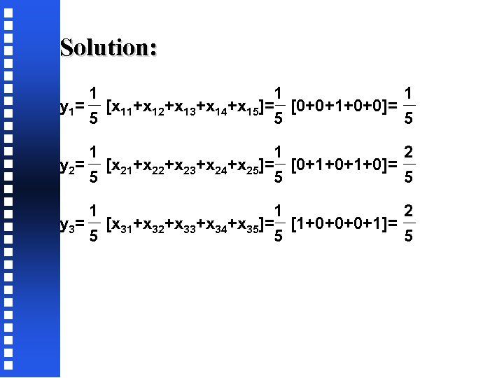 Solution: 1 1 1 y 1= [x 11+x 12+x 13+x 14+x 15]= [0+0+1+0+0]= 5 5 5 1 1 2 y 2= [x 21+x 22+x 23+x 24+x 25]= [0+1+0]= 5 5 5 1 1 2 y 3= [x 31+x 32+x 33+x 34+x 35]= [1+0+0+0+1]= 5 5 5
