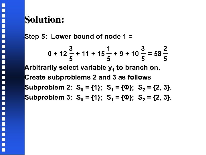 Solution: Step 5: Lower bound of node 1 = 3 1 3 2 0 + 12 + 11 + 15 + 9 + 10 = 58 5 5 Arbitrarily select variable y 1 to branch on. Create subproblems 2 and 3 as follows Subproblem 2: S 0 = {1}; S 1 = { }; S 2 = {2, 3}. Subproblem 3: S 0 = {1}; S 1 = { }; S 2 = {2, 3}.
