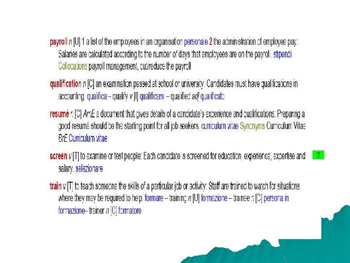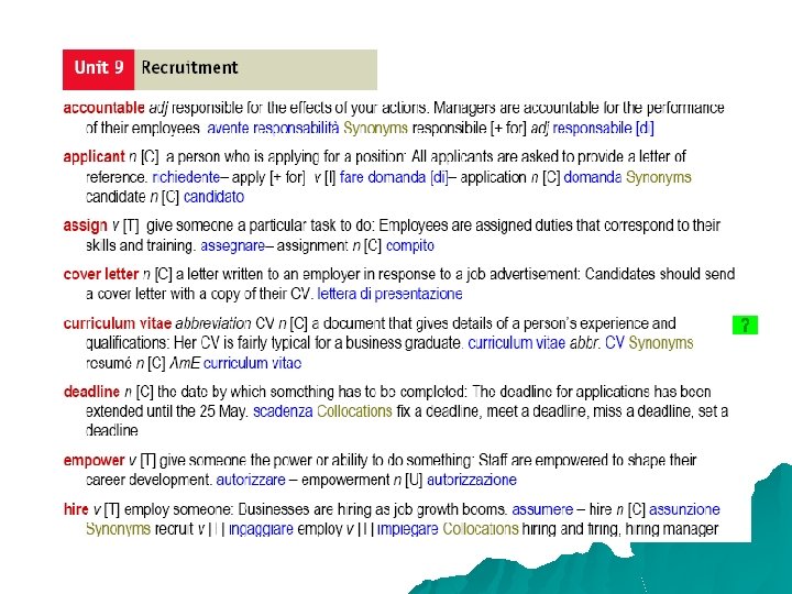 Vocabulary on recruitment : Match the words and phrases 1 -3 with the definitions a-c a. 1. Apprenticeship 2. Work placement 3. Graduate trainee scheme b. c. 1 c, 2 a, 3 b Students often take a temporary job during their studies – for little or no pay – because they want to get experience Big companies accept a number of newly qualified people to work for one year. They get general experience by working in different departments. They may or may not get a permanent job at the end. A young person learns a skill or trade by working under supervision in a company. They have a contract to work there for a fixed number of years