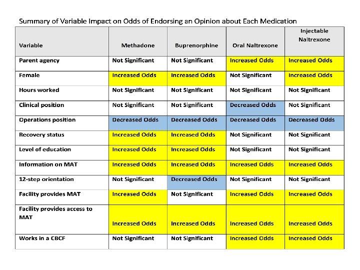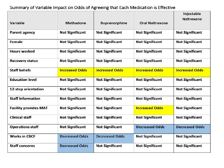 Summary • • • Staff who demonstrated a higher level of agreement with statements indicating positive outcomes of MAT were significantly more likely to endorse the use of buprenorphine, oral naltrexone, and injectable naltrexone as acceptable. Higher endorsement of items reflecting concerns with MAT produced a significantly lower odds of agreeing that three of the medications were acceptable for use with correctional clients; these medications were methadone, buprenorphine, and oral naltrexone. While not statistically significant at the p=. 05 level, staff concerns did approach significance as a predictor of acceptability for injectable naltrexone as well (p=06). Working in a facility that directly provided MAT was also a statistically significant predictor of endorsing the acceptability of methadone, oral naltrexone, and injectable naltrexone. it served to decrease the probability that staff would endorse methadone as acceptable, however.