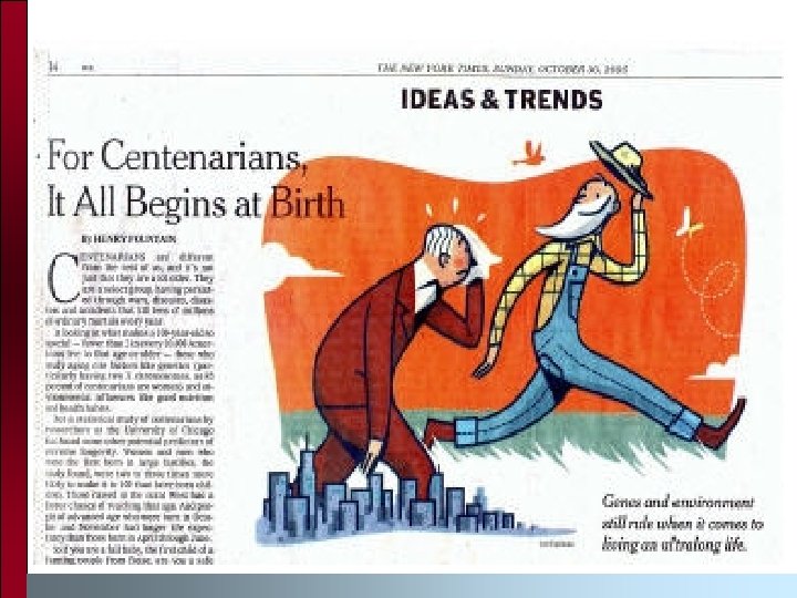 Computerized Genealogies as a Resource for Longevity Studies n Pros: provide important information about family and life-course events, which otherwise is difficult to collect (including information about lifespan of parents and other relatives) n Cons: Uncertain data quality Uncertain validity and generalizability