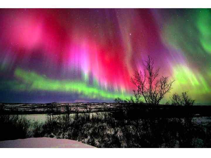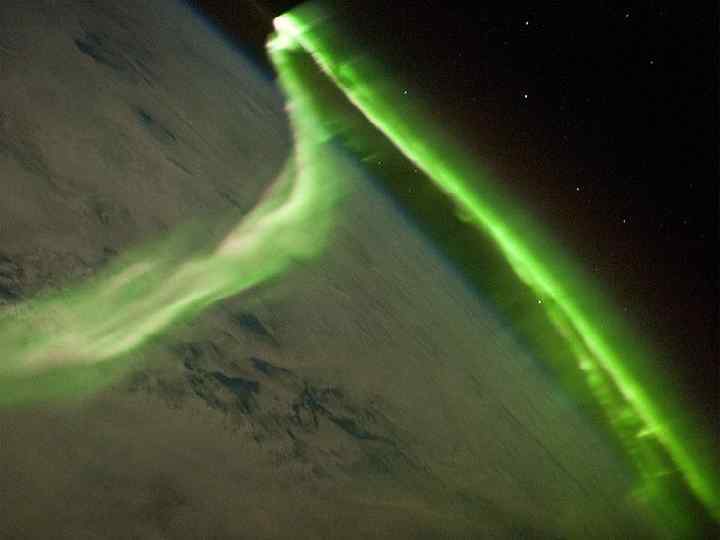 AURORA • The aurora is the name given to the bands of colored lights seen in the sky at the higher latitudes. The aurora borealis or Northern Lights are seen mainly near the Arctic Circle. The aurora australis or Southern Lights are seen in the southern hemisphere. The light you see comes from photons released by oxygen and nitrogen in the upper atmosphere. Energetic particles from the solar wind strike the layer of the atmosphere called the ionosphere, ionizing the atoms and molecules. When the ions return to the ground state, energy released as light produces the aurora.