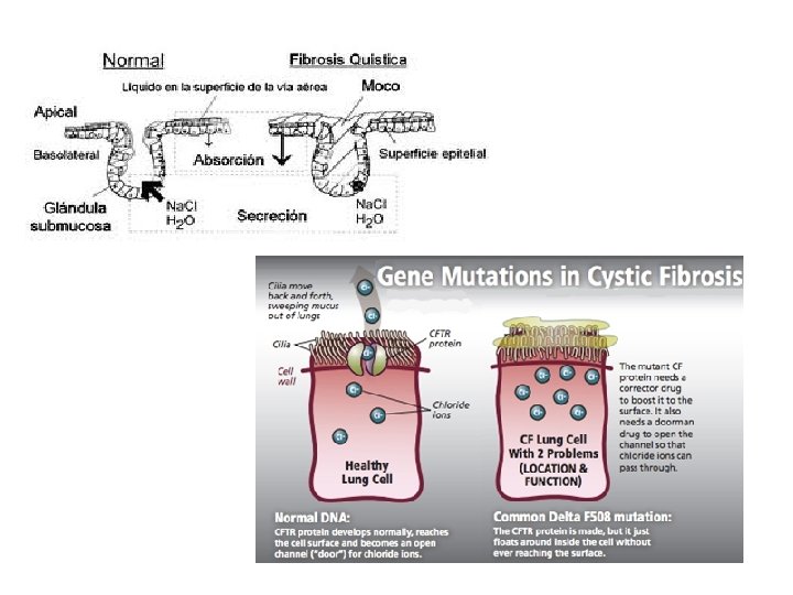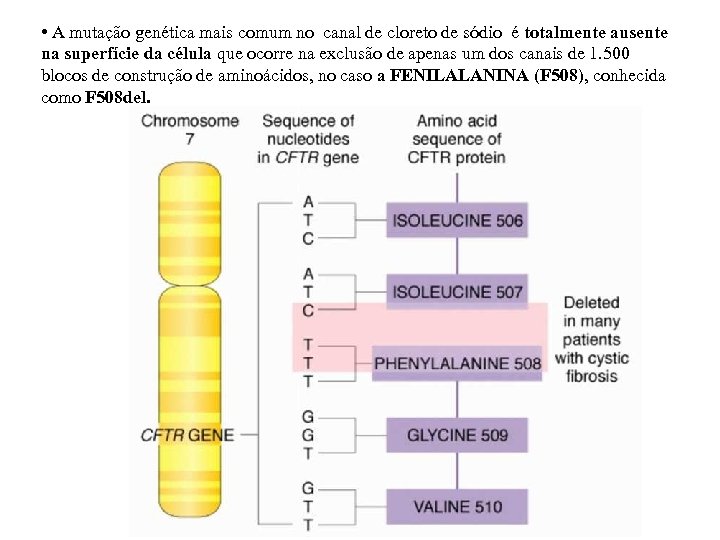 • A mutação genética mais comum no canal de cloreto de sódio é totalmente ausente na superfície da célula que ocorre na exclusão de apenas um dos canais de 1. 500 blocos de construção de aminoácidos, no caso a FENILALANINA (F 508), conhecida como F 508 del.