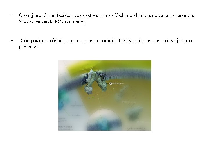 • O conjunto de mutações que desativa a capacidade de abertura do canal responde a 5% dos casos de FC do mundo; • Compostos projetados para manter a porta do CFTR mutante que pode ajudar os pacientes.