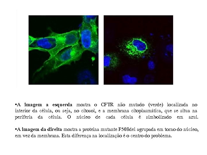 • A imagem a esquerda mostra o CFTR não mutado (verde) localizada no interior da célula, ou seja, no citosol, e a membrana citoplasmática, que se situa na periferia da célula. O núcleo de cada célula é simbolizado em azul. • A imagem da direita mostra a proteína mutante F 508 del agrupada em torno do núcleo, em vez da membrana. Esta diferença na localização é o centro do problema.