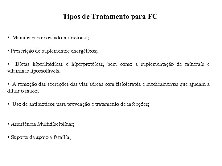 Tipos de Tratamento para FC • Manutenção do estado nutricional; • Prescrição de suplementos energéticos; • Dietas hiperlípidicas e hiperprotéicas, bem como a suplementação de minerais e vitaminas lipossolúveis. • A remoção das secreções das vias aéreas com fisioterapia e medicamentos que ajudam a diluir o muco; • Uso de antibióticos para prevenção e tratamento de infecções; • Assistência Multidisciplinar; • Suporte de apoio a família;
