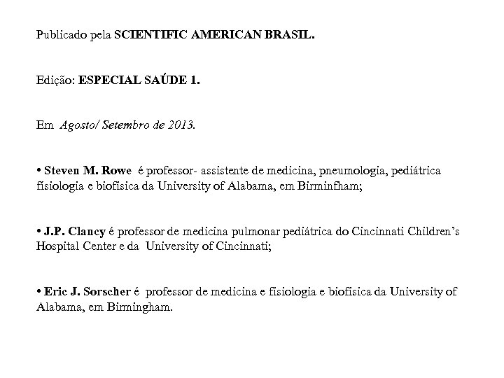 Publicado pela SCIENTIFIC AMERICAN BRASIL. Edição: ESPECIAL SAÚDE 1. Em Agosto/ Setembro de 2013. • Steven M. Rowe é professor- assistente de medicina, pneumologia, pediátrica físiologia e biofisica da University of Alabama, em Birminfham; • J. P. Clancy é professor de medicina pulmonar pediátrica do Cincinnati Children’s Hospital Center e da University of Cincinnati; • Eric J. Sorscher é professor de medicina e fisiologia e biofisica da University of Alabama, em Birmingham.