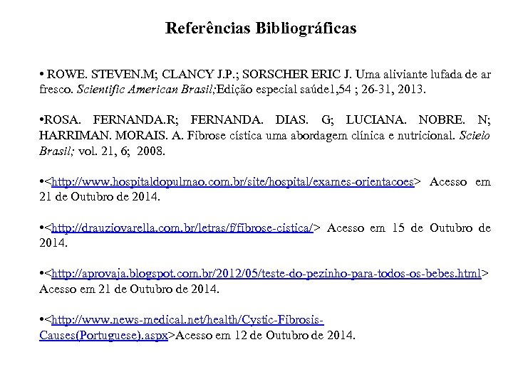 Referências Bibliográficas • ROWE. STEVEN. M; CLANCY J. P. ; SORSCHER ERIC J. Uma aliviante lufada de ar fresco. Scientific American Brasil; Edição especial saúde 1, 54 ; 26 -31, 2013. • ROSA. FERNANDA. R; FERNANDA. DIAS. G; LUCIANA. NOBRE. N; HARRIMAN. MORAIS. A. Fibrose cística uma abordagem clínica e nutricional. Scielo Brasil; vol. 21, 6; 2008. • <http: //www. hospitaldopulmao. com. br/site/hospital/exames-orientacoes> Acesso em 21 de Outubro de 2014. • <http: //drauziovarella. com. br/letras/f/fibrose-cistica/> Acesso em 15 de Outubro de 2014. • <http: //aprovaja. blogspot. com. br/2012/05/teste-do-pezinho-para-todos-os-bebes. html> Acesso em 21 de Outubro de 2014. • <http: //www. news-medical. net/health/Cystic-Fibrosis. Causes(Portuguese). aspx>Acesso em 12 de Outubro de 2014.