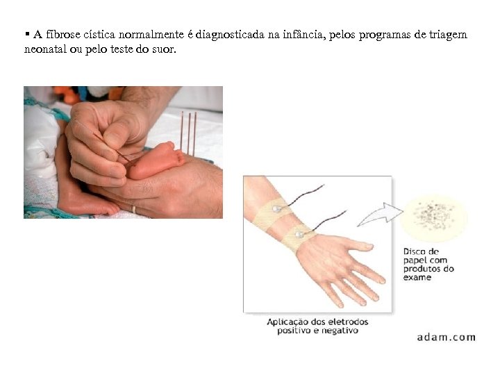 § A fibrose cística normalmente é diagnosticada na infância, pelos programas de triagem neonatal ou pelo teste do suor.