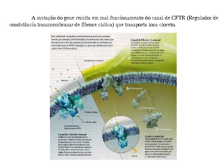 A mutação do gene resulta em mal-funcionamento do canal de CFTR (Regulador de condutância transmembranar de fibrose cística) que transporta íons cloreto.