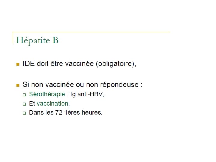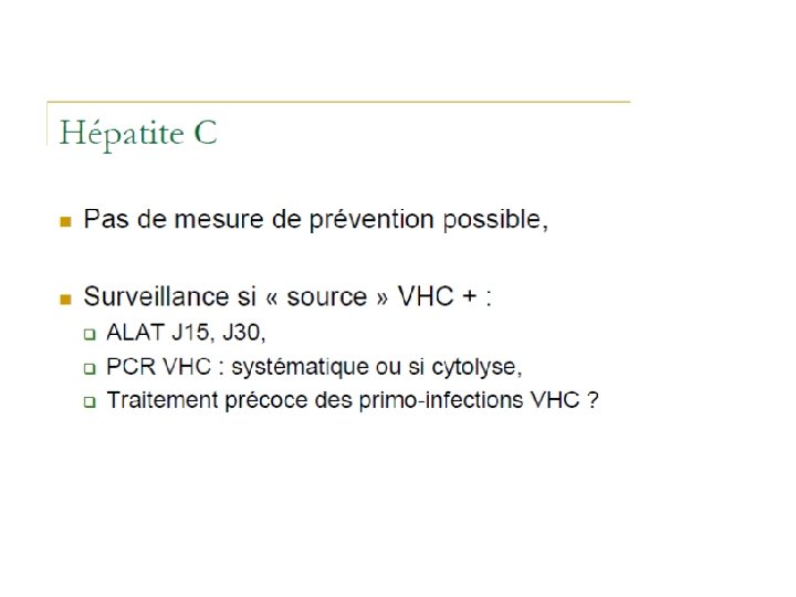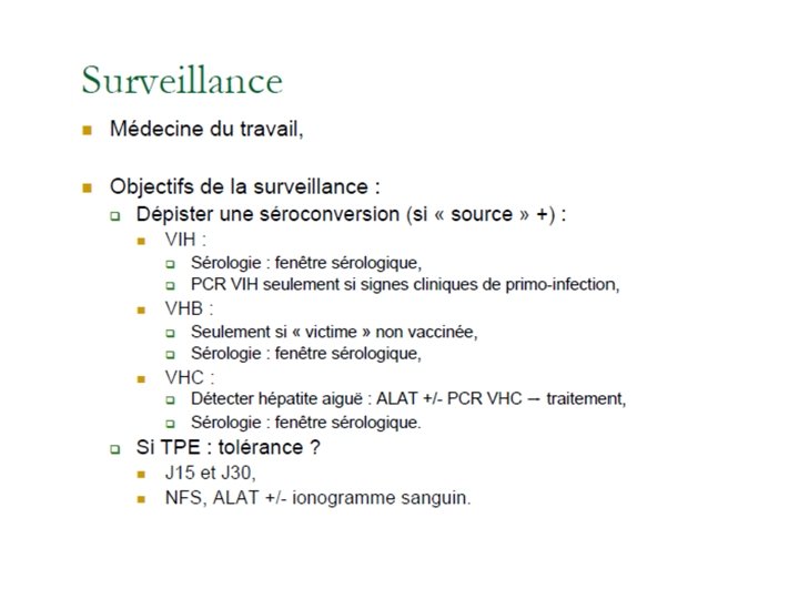 Etablir le statut sérologique de la ‘victime’ Utilisation de la PCR HCV À la place de la sérologie Ac anti. HIV négatif à M 3 après le contage = non infecté Ac anti. HIV négatif 3 mois après arrêt du TPE soit M 4 = non infecté