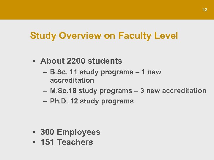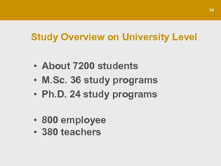 10 Study Overview on University Level • About 7200 students • M. Sc. 36 study programs • Ph. D. 24 study programs • 800 employee • 380 teachers